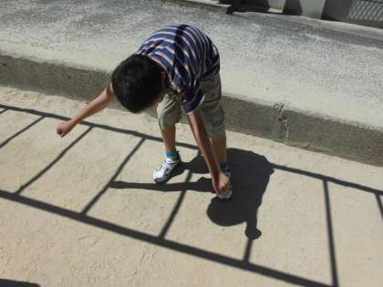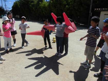 体育用具や文房具などの組み合わせを試しながら,かげの形を楽しみました。光の当たり方でかげの大きさや形が変わる面白さを知ることができました。最後に,班ごとにどんなかげができたか交流しました。