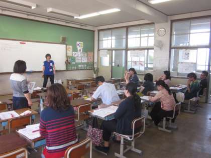 来週金曜日の授業研修に向けて,教師が子ども役となって進める模擬授業を行いました。「こんな時,子どもたちはこう考えるのではないかな」「こういった発問の方がいいかな」教職員連携しあって授業の在り方を研究しています。、
