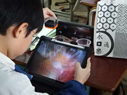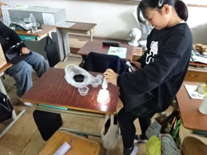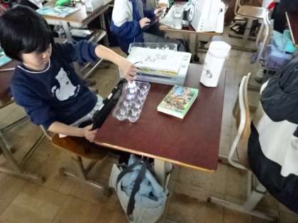 「光と場所のハーモニー」の学習です。暗がりにした教室で、透明な容器に水を入れて、光を当てたときにできる世界を、思い思いに作り出しています。真剣な表情で学習に取り組んでいます。