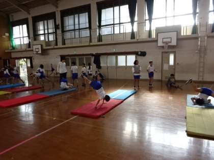 マット運動の学習です。それぞれがめあてをもって、技に挑戦しています。