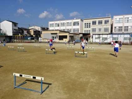 ハードル走に取り組んでいます。ハードルを跳び越えるのではなく、またぎ越すイメージで、スピードを落とさずに走り抜けることを心がけて取り組んでいます。