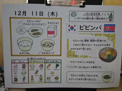 今日の献立は、「麦ごはん・牛乳・ビビンバ(具)肉と卵・ビビンバ(具)ナムル・わかめスープ」でした。ビビンバは韓国・朝鮮の料理で、具をごはんにのせて混ぜていただきます。みんな大好きな一品です。今日も美味しい給食、ごちそうさまでした!