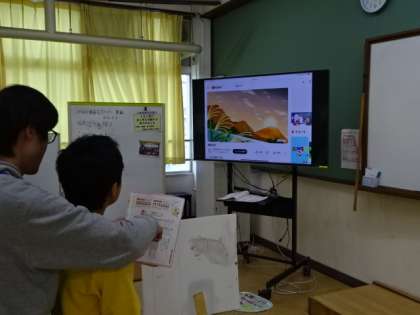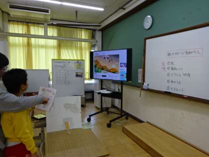 音楽の時間の様子です。歌詞やメロディーから情景を思い浮かべながら、先生と一緒に歌っていました。