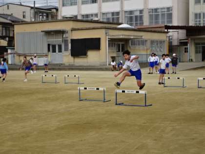 ハードル走に取り組んでいます。スピードを落とさずにハードルを越していけるように頑張っていました。