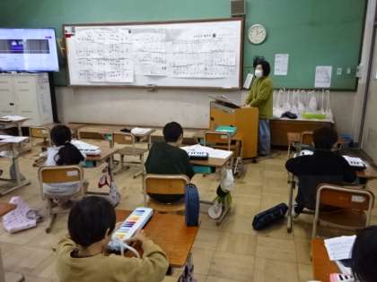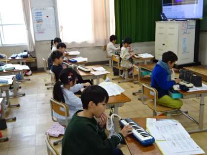 鍵盤ハーモニカでの演奏に取り組んでいる2年生。きれいな音色を出せるように気をつけて演奏しています。
