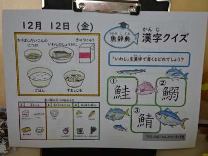 今日の献立は、「ごはん・牛乳・いわしのしょうが煮・切り干し大根の煮つけ・すまし汁」でした。お魚の漢字クイズ、「いわし」は次のうちどのように書くでしょうか?「鮭」「鰯」「鯖」。答えは?今日も美味しい給食、ごちそうさまでした!