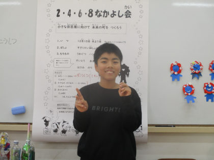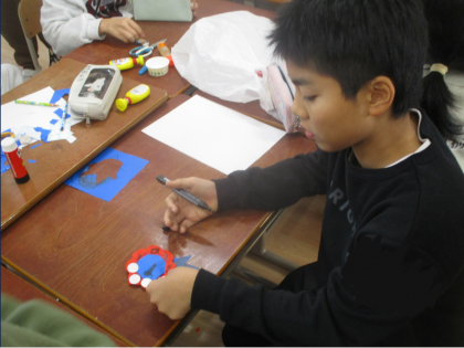 5・6年生は、ミャクミャクを作りました。折り紙をミャクミャクの形に折り、シールに目を描いて貼ることをがんばりました。