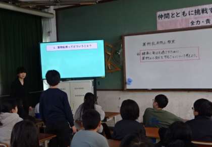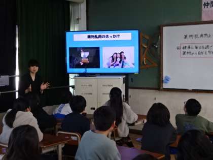 学校薬剤師の先生と一緒に学習しました。最近の情勢や、危険が身近なところに迫っていることがわかり、自身の身を守るためにどうすべきか、じっくり考えることができました。誘われたときにはどのように断ればいいか、薬剤師の先生から経験談も交えてお話しいただき、あらためて確かめることもできました。専門的な立場からお話しいただき、子どもたちにとっても有意義な学習となりました。