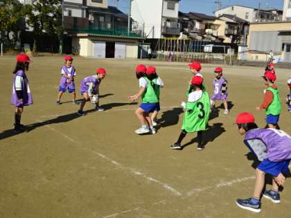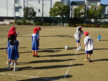 ころがしドッジボールをしています。作戦タイムでは、同じチームのメンバーと頭を突き合わせて、考えを出し合っています。勝負にこだわってくるようになり、ゲームでは盛り上がりが出てきています。