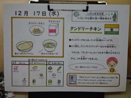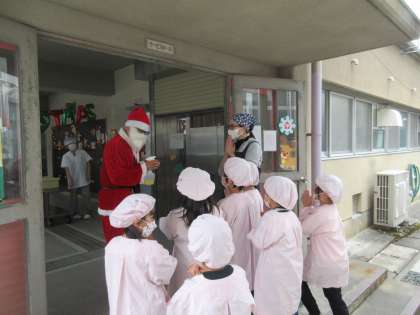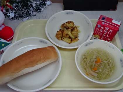 今日の献立は、「味つけコッペパン・牛乳・タンドリーチキン・キャベツのスープ」でした。今日はタンドリーチキンということで、給食室にサンタクロースが来てくれました!今日も美味しい給食、ごちそうさまでした!