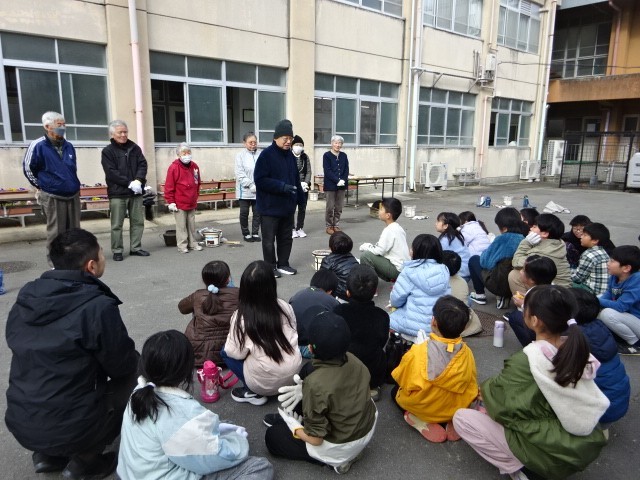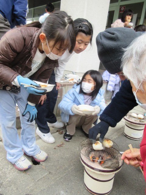 地域の方々にもお手伝いしていただいて、七輪を使っての餅焼き体験を行いました。今ではスイッチ1つで料理することができるようになりましたが、昔は火をつけるだけでも一苦労だったということに、子どもたちは気が付いた様子でした。活動の最後には、自分たちが一生懸命焼いたお餅を醤油につけて食べました。子どもたちは手伝ってもらった地域の方々に感謝して、とてもおいしそうにお餅を食べていました。教科書やテレビで見るだけでなく、実際に体験してみることで得られた学びが大きいことを実感しました。