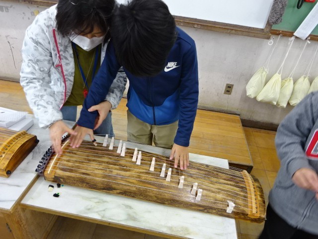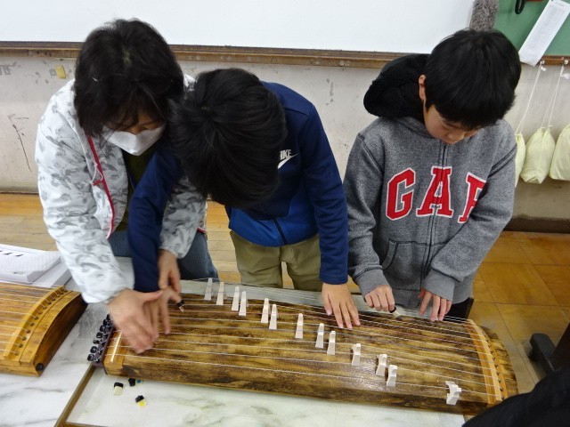 「日本の音楽でつながろう」の学習で、琴の演奏に取り組んでいます。実際に琴に触れ演奏しながら、事の音色を味わっています。