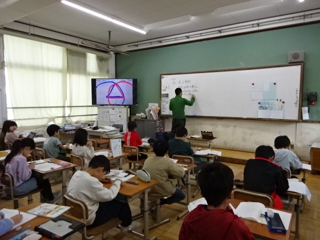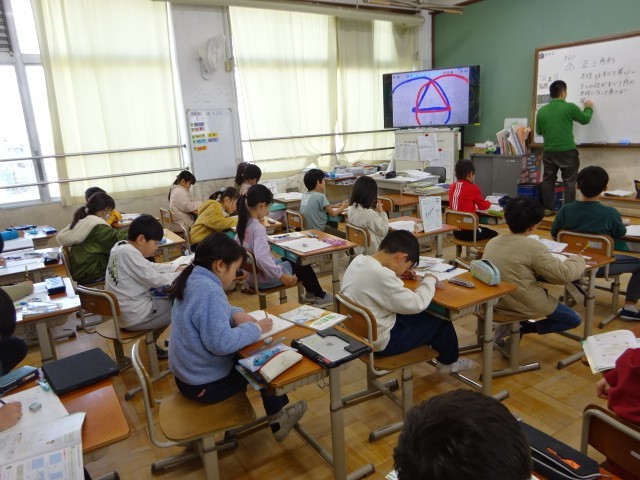 算数では「正三角形」「二等辺三角形」について学習しています。「辺」や「ちょう点」「角」などの用語も確認しながら、三角形の特徴を調べています。