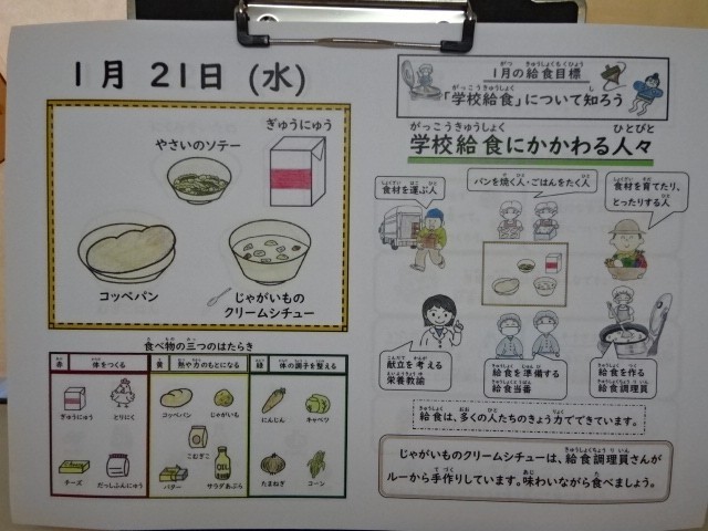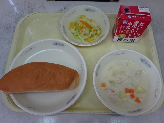 今日の献立は、コッペパン(国内産小麦100%)・牛乳・じゃがいものクリームシチュー・野菜のソテー」でした。寒い季節のシチューは、食べるとほっこりします。今日も美味しい給食、ごちそうさまでした!