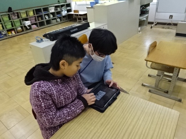3組は、学習してきたことを動画に編集して、全校のみんなに伝えます。先生と一緒に最後の確認をしています。