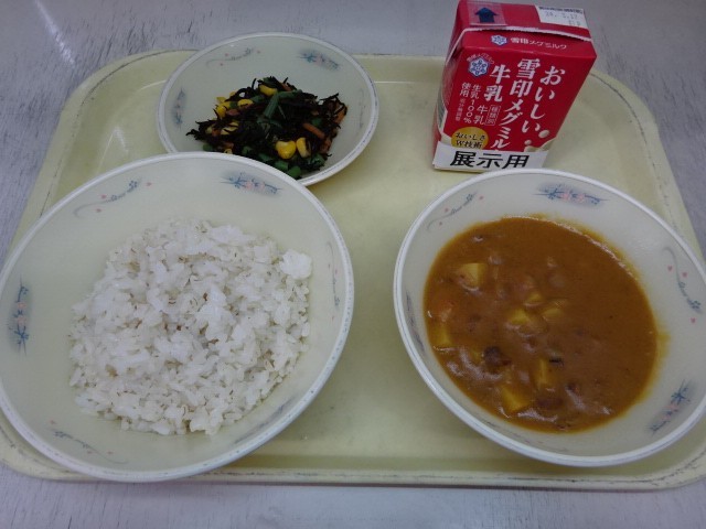 今日の献立は、「麦ごはん・牛乳・カレー・ひじきのソテー」でした。大人気メニューで、みんなおかわりをして、ご飯も完食する学年が多かったです。今日も美味しい給食、ごちそうさまでした!