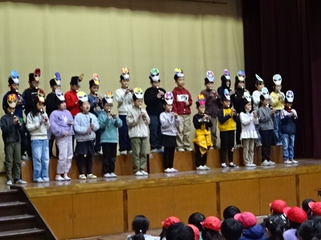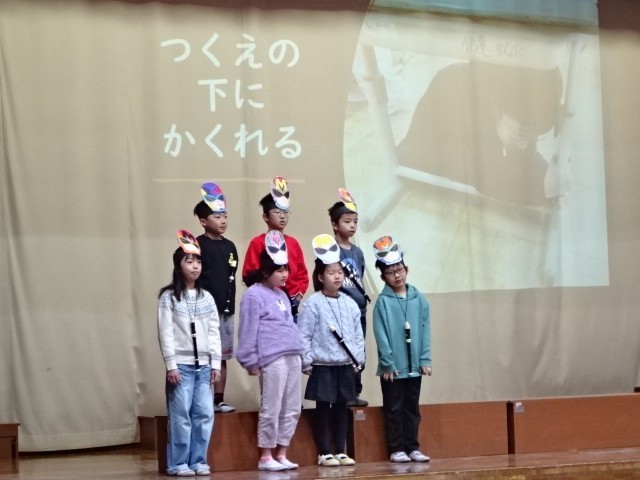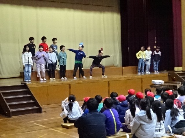 地域の方々と一緒に防災について学習したことを、クイズ形式も取り入れながら全校に向けて発表しました。災害から自分たちの身を守る方法を、3年生の発表から学ぶことができました。