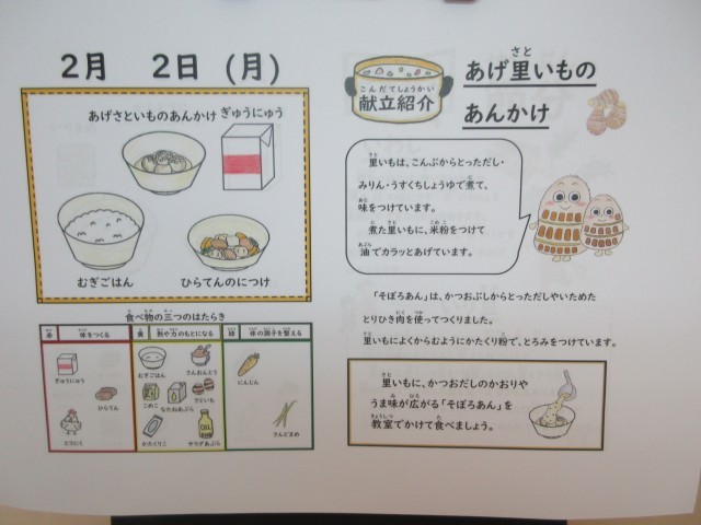 今日の献立は、「麦ごはん・牛乳・平天の煮つけ・揚げ里いものあんかけ」でした。今日も美味しい給食、ごちそうさまでした!