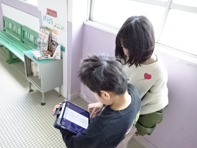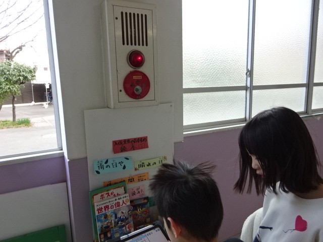 社会の時間に、校内の消防設備を探して回る3年生。調べたことをタブッレトで記録しています。