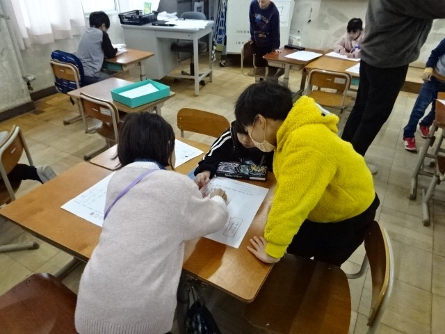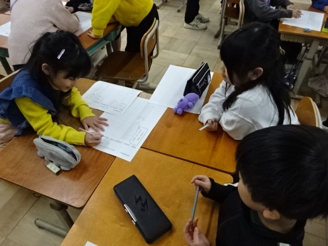 国語の学習での、話合い活動の場面です。少人数で友だちと意見交流をすることで、学習を深めていきます。1年生、頑張っています。