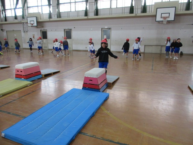 踏み切り板を勢いよく「トン」と踏み切り、手をぱーにして「パン」と押し出すことを意識しながら取り組みました。
