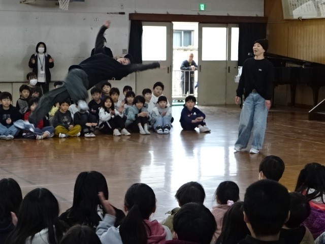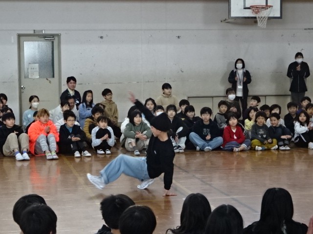 本校の卒業生で、パリ五輪にブレイキンで出場した福島あゆみ選手に来ていただき、ブレイキンの魅力を伝えてくれました。最初に、福島選手と、一緒に来ていただいたチームメイトの方々にダンスを披露していただきました。キレのあるダンスにみんなも大喜びでした。