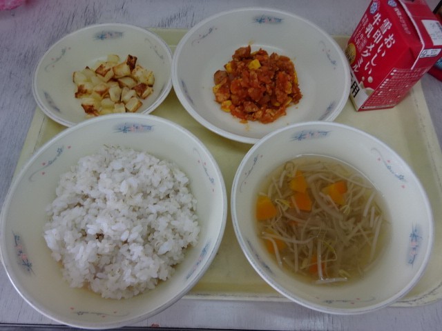 今日の献立は、「麦ごはん・牛乳・チキンライス(具)・ローストポテト・スープ」でした。ローストポテトは、スチームコンベクションオーブンで焼いた新献立でした。今日も美味しい給食、ごちそうさまでした!