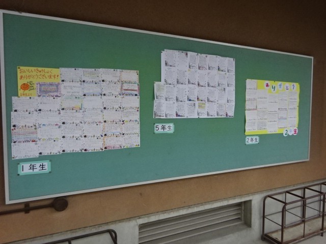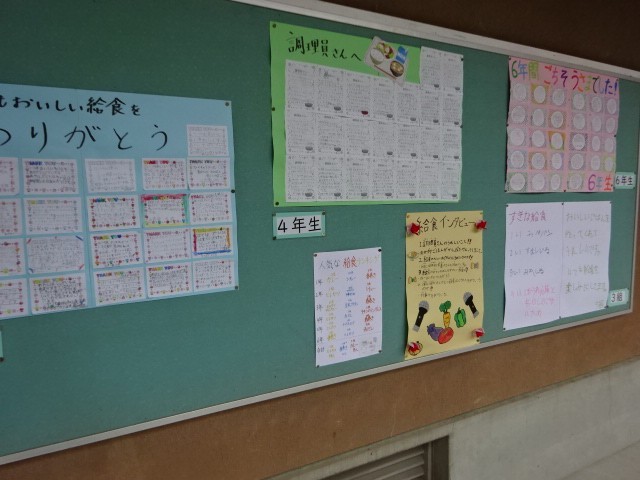 給食週間で、掲示板には、日ごろの給食への感謝を綴ったメッセージが掲載されています。これからも美味しい給食、よろしくお願いします。