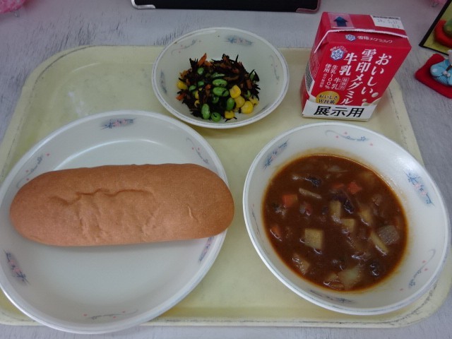 今日の献立は、「味つけコッペパン・牛乳・ビーフシチュー・ひじきのソテー」でした。具だくさんのビーフシチューにみんな大喜び。ペロリと食べていました。今日も美味しい給食、ごちそうさまでした!