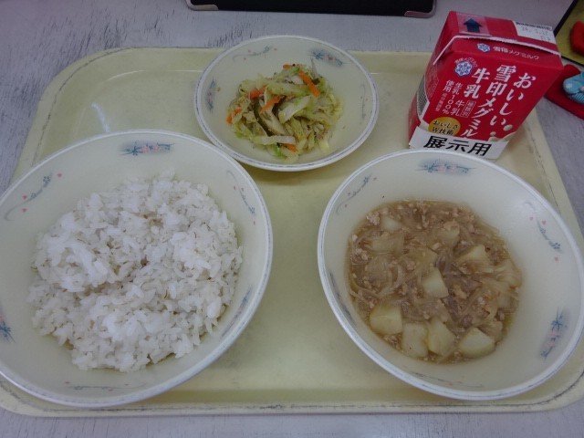 今日の献立は、「麦ごはん・牛乳・じゃがいものそぼろ煮・ごま酢煮」でした。ごま酢煮は、ゆずの香りとともにいただきました。今日も美味しい給食、ごちそうさまでした!