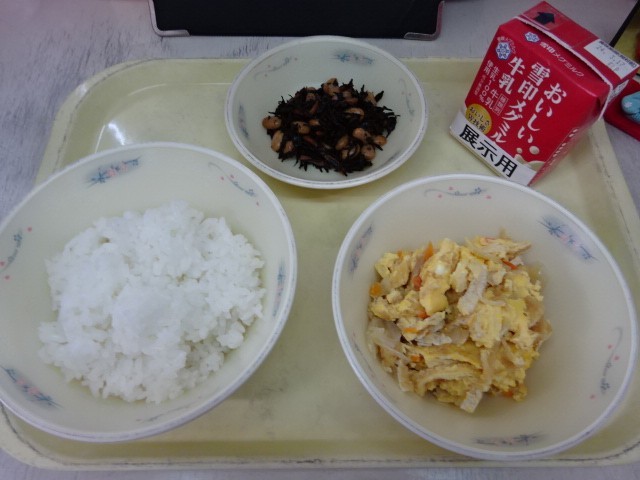今日の献立は、「ごはん・牛乳・あげたま煮・ひじき豆」でした。あげたま煮は、ふっくらとしたたまごの食感とだしのうま味を感じながらいただきました。今日も美味しい給食、ごちそうさまでした。