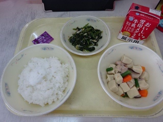 今日の献立は、「ごはん・牛乳・高野どうふと野菜のたき合わせ・ほうれん草ともやしのごま煮・ふりかけ」でした。具だくさんのたき合わせとともに「ふりかけ」もついていたので、ご飯をみんなよく食べていました。今日も美味しい給食、ごちそうさまでした。