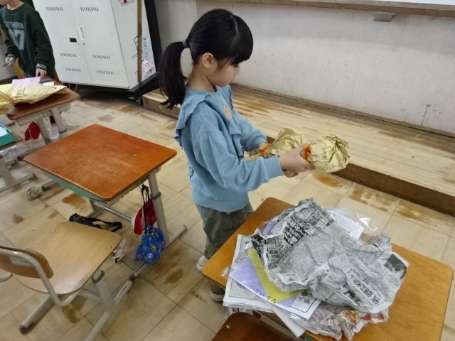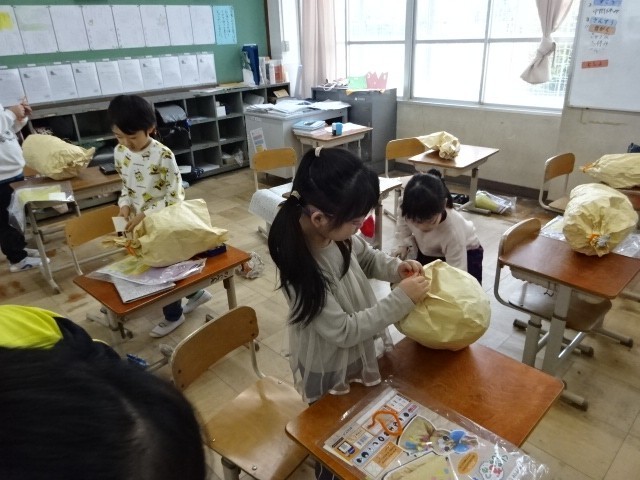 「くしゃくしゃ ぎゅっ」の学習です。紙袋の中にくしゃくしゃに丸めた新聞紙を入れて、思い思いに作品を作ります。ユニーかな作品が出来上がり、みんな楽しそうに活動しています。