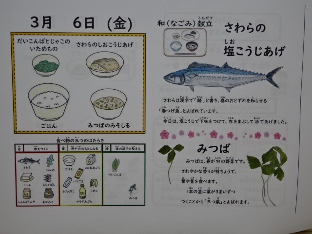 今日の献立は、「ごはん・さわらの塩こうじあげ・だいこん葉とじゃこのいためもの・みつばのみそ汁」でした。今日は「和献立」の日でした。今日も美味しい給食、ごちそうさまでした!