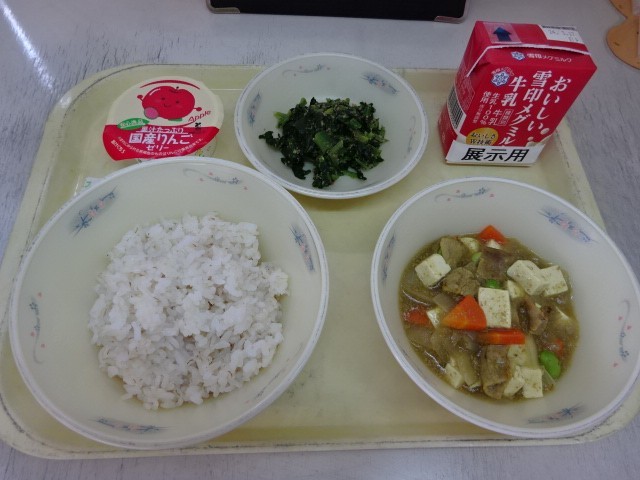 今日の献立は、「麦ごはん・牛乳・和風カレーどうふ・ほうれん草のごま煮」でした。いつもと違うカレーの風味を感じながらいただきました。今日も美味しい給食、ごちそうさまでした!