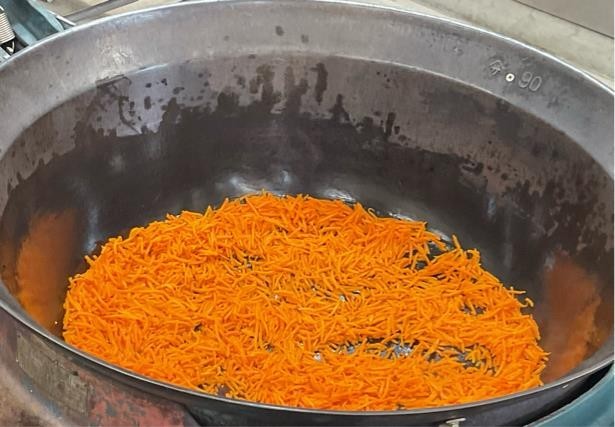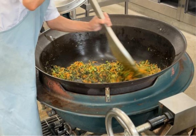 小松菜のごまいためは、にんじんをゆっくりと炒めることで濃い甘みを感じられるようにしました。また、小松菜は炒める前に茹でて、シャキシャキとした食感を楽しみながらも、柔らかく食べやすいように水の絞り具合も調整しました。