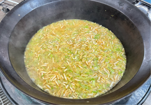 春野菜の味噌汁には旬の春キャベツと新玉ねぎを使いました。肉厚な春キャベツは出来上がり間近に加えてもやわらかく、彩よく仕上げられました。