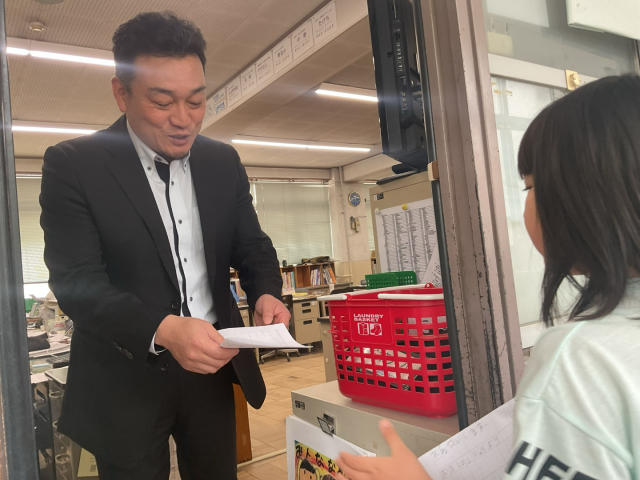 教職員の皆さんに、インタビューのお願いをしに行っている様子です。少し緊張した様子でしたが、「お願いします。」と伝え、お手紙を渡すことができました。