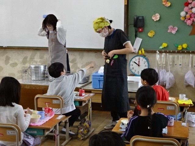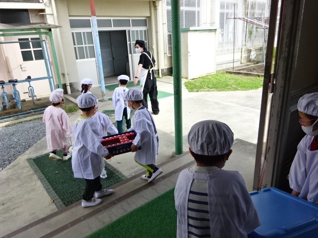 1年生も給食時間、自分たちで用意を頑張っています。まだ、先生に手伝ってもらいながらではありますが、重たいものも友だちと力を合わせて頑張っています。栄養教諭の先生にも、食材のお話を聞いたりしながら、給食に興味をもってしっかりといただいています。