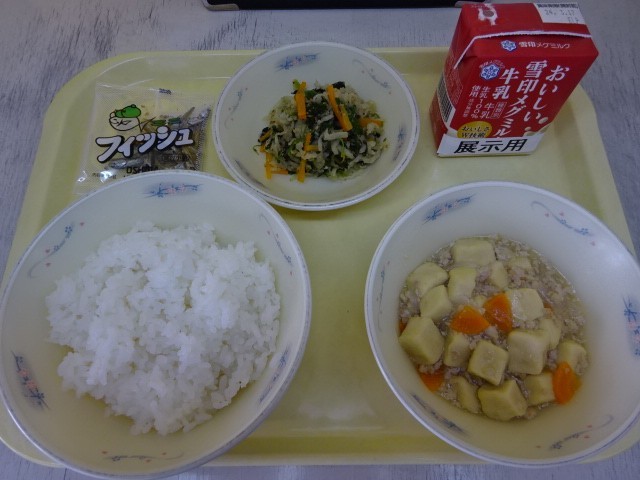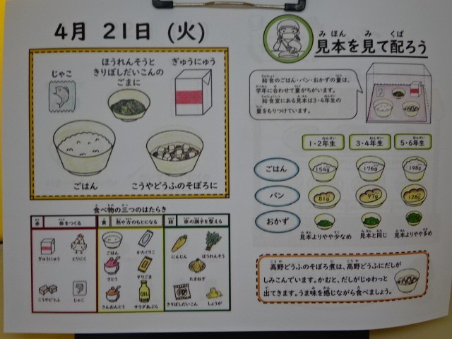 今日の献立は、「ごはん・牛乳・高野どうふのそぼろ煮・ほうれん草と切干大根のごま煮・じゃこ」でした。4月は給食の用意がスムーズにできることも目標に、給食の時間を過ごしています。今日も美味しい給食、ごちそうさまでした!