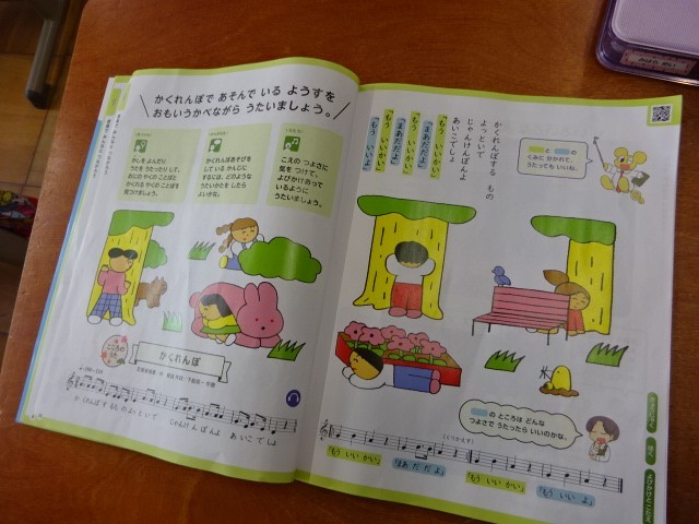 「かくれんぼ」の歌を歌っていました。「もういいかい」「まあだだよ」の掛け合いを楽しみながら、かくれんぼあそびをしている様子を思い浮かべながら歌っていました。