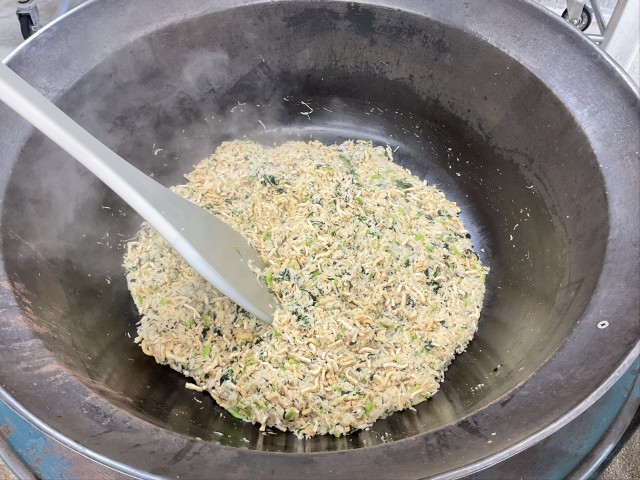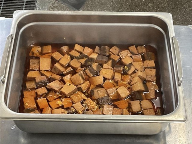 なま節のしょうが煮はなま節をスチームコンベクションオーブンで加熱しました。砂糖・みりん・料理酒・濃口しょうゆ・薄口しょうゆを合わせた調味液とみじん切りにしたしょうが、なま節を合わせて時間をかけて加熱することで、なま節の中までしっとりと味を浸み込ませました。