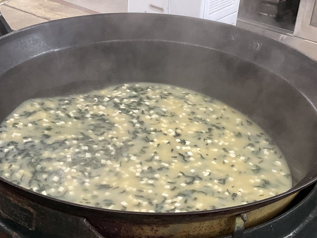 今日の味噌汁には豆腐・わかめ・玉ねぎを使っています。わかめの食感を残せるように、たまねぎが柔らかくも溶けてしまわないようにしました。