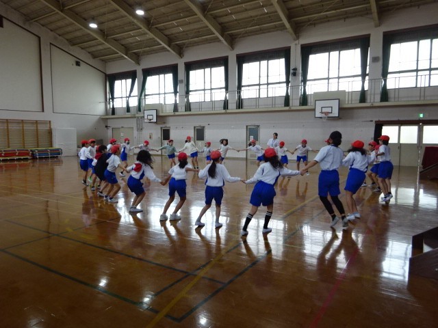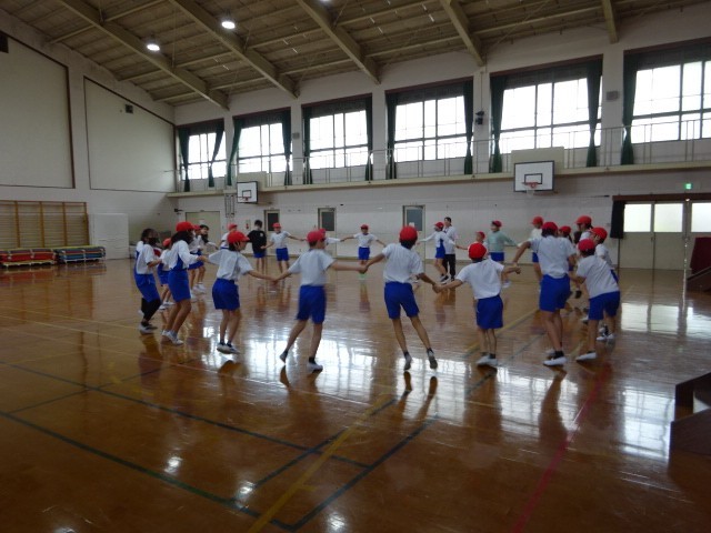 体育の時間、体ほぐしの運動をして汗を流しています。「あんたがさ どこさ」を歌いながら、 みんなでリズムよく跳んでいるところです。