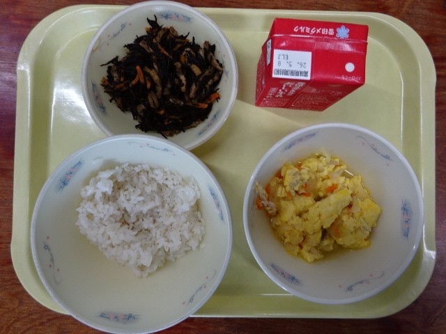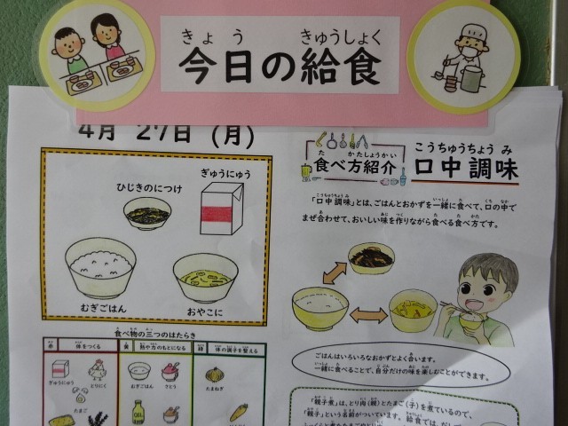 今日の献立は、「麦ごはん・牛乳・親子煮・ひじきの煮つけ」でした。「口中調味」、ごはんとおかずを一緒に食べて、くちの中でおいしい味を作りながらいただきます。今日も美味しい給食、ごちそうさまでした!
