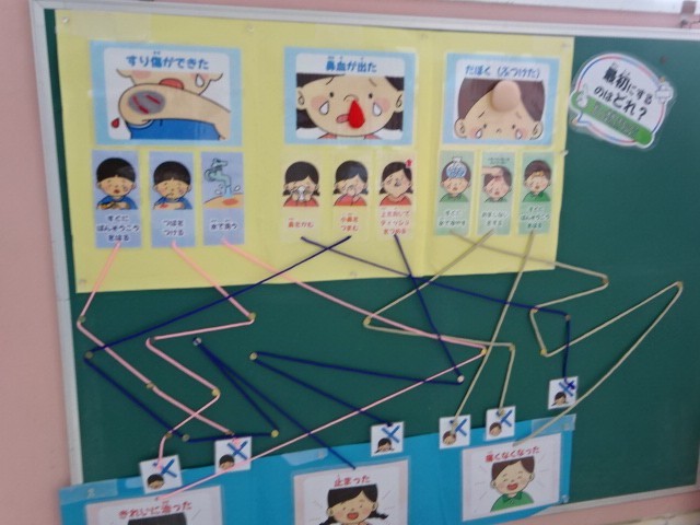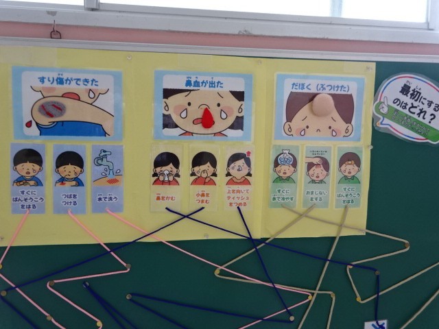 学校生活、みんな安全に過ごすことを心がけていますが、、もしケガをしたらどうしたらいいのでしょう。保健室で手当てをしてもらう前に自分でできることも身につけていってほしいです。保健室前の掲示板を見て、また考えてみてくださいね。