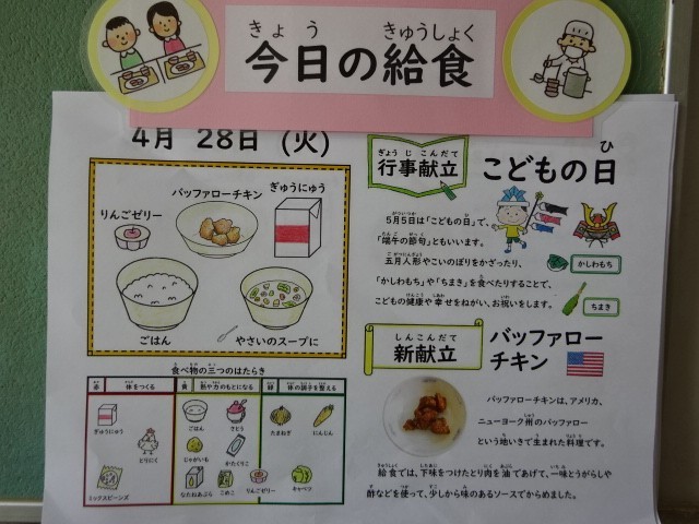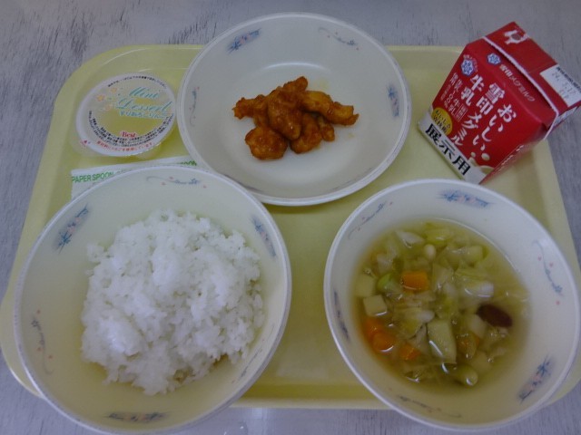 今日の献立は、「ごはん・牛乳・バッファローチキン・野菜のスープ煮・りんごゼリー」でした。バッファローチキンは新献立でしたが、みなさん感想はいかがでしょうか?今日も美味しい給食、ごちそうさまでした!