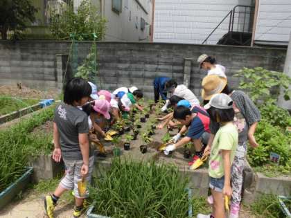 今回は,まず夏に向けて,校門を入ってすぐのところに毎年作っている緑のカーテンの苗を植えました。その後,花壇にも花の苗を植えたり,今年整備した朱七みどりクラブの畑にも苗を植えました。