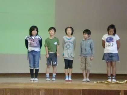 学校の中には80種類以上の植物がある事や、メダカ池の水の中と周りにある植物について、調べて分かったことを発表しました。全校のみんなは、80種類以上の植物がある事に驚いた様子で、静かに聞いてくれていました。