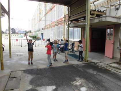 朱雀第七小学校の正門を入ったところの渡り廊下に,ミスト装置が設置されました。これは京都市上下水道局の取組で,本校が簡易ミスト装置のモニターに選ばれ,器材を提供してくださったものです。